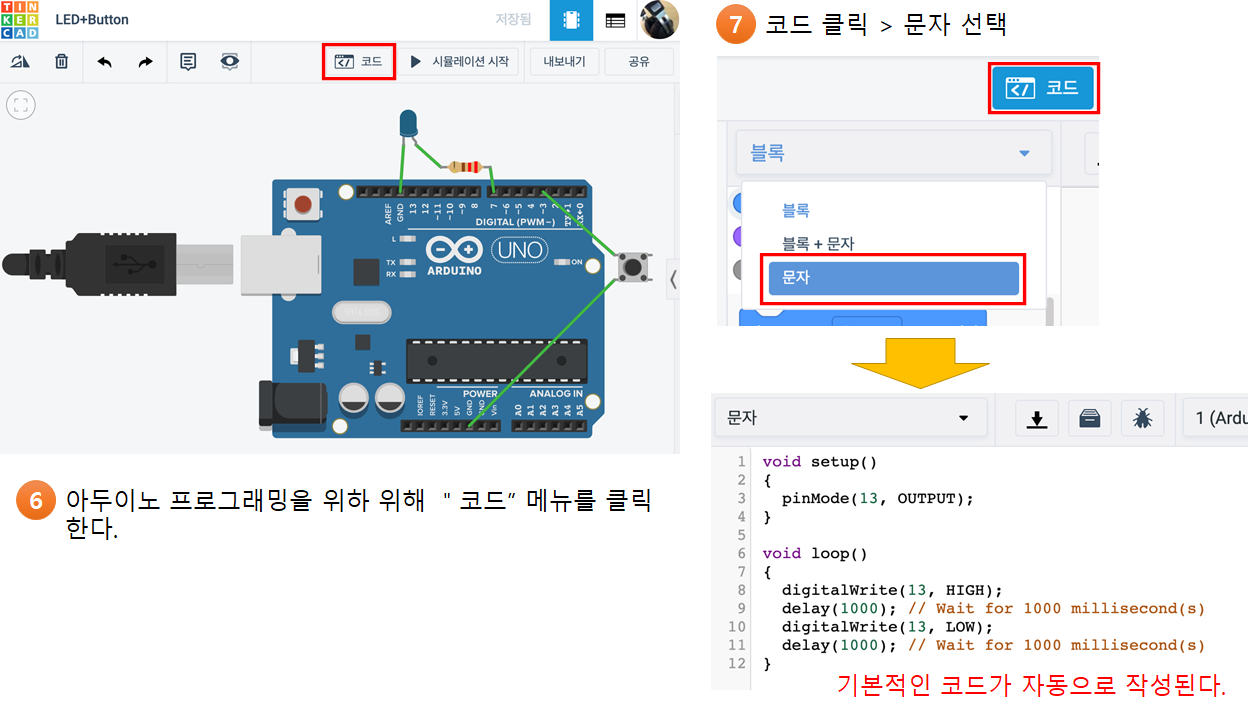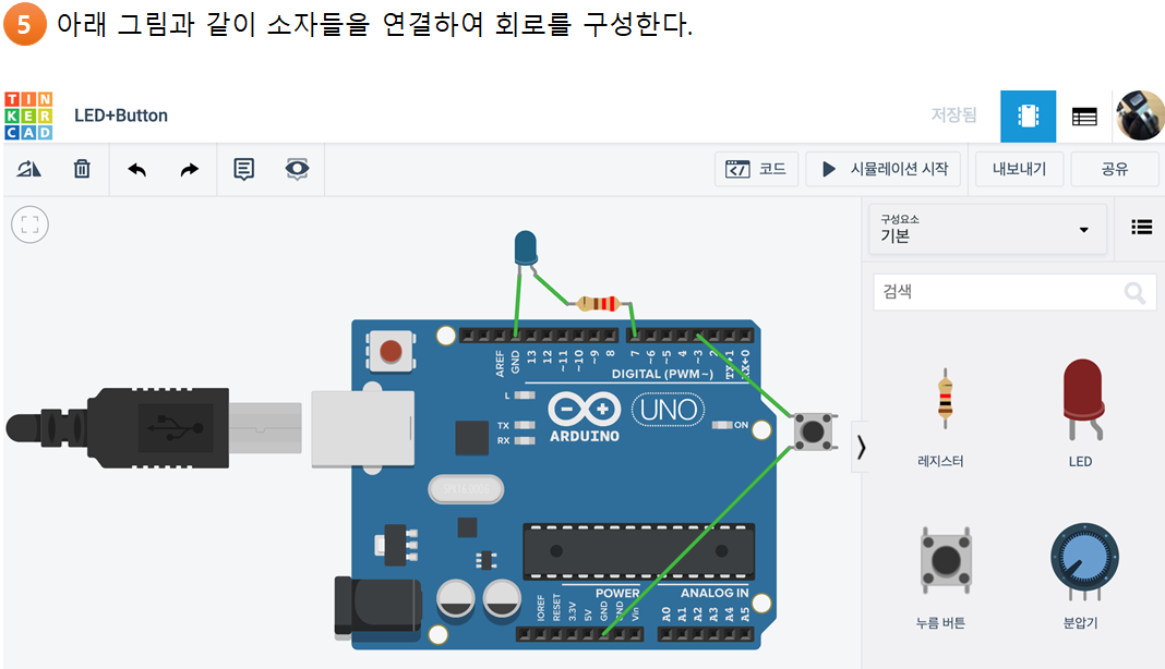 • 아두이노에 7번핀에 LED를 연결하고, 3번 핀에 택트 버튼(tact button)연결한다.