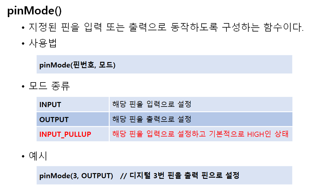 2. 버튼이 연결된 핀의 상태가 HIGH이면 LED ON, 핀의 상태가 LOW이면 LED OFF. 즉 평상시 버튼의 상태는 HIGH이므로 PULL-UP 회로가 동작한다. → pinMode(btn, INPUT_PULLUP)