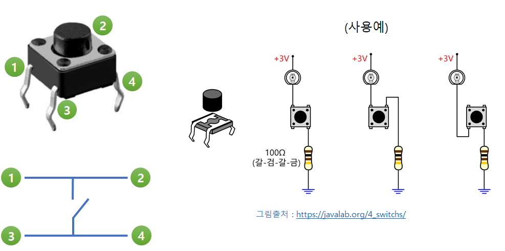 1. 버튼의 한쪽은 전원에, 다른 한쪽은 접지(GND)에 연결된다.