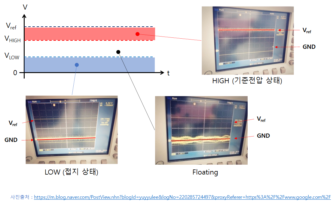 • 마지막으로, Floating은 측정하고자 하는 지점의 상태를 명시적으로 High나 Low로 정의하지 않은 상태라서 논리적으로 어떤 값이 될지 알 수 없는 상태, 즉 떠있는(floating) 상태를 의미한다.