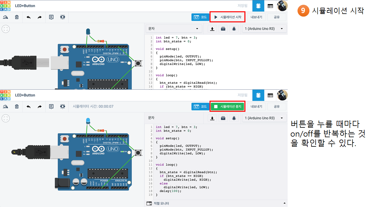 2. 버튼의 누름 상태에 따라 아두이노 7번 핀에 5V와 0V를 번갈아 가며 공급해야 한다.