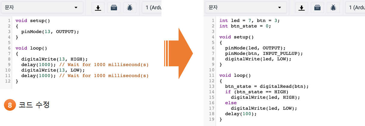 3. 버튼이 연결된 핀의 상태가 HIGH인지 LOW인지 확인해야 한다. → if (btn_state == HIGH), else