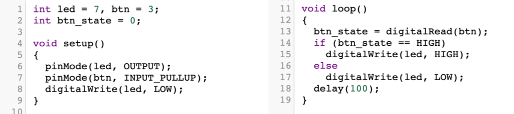 → pinMode(btn, INPUT), btn_state = digitalRead(btn)