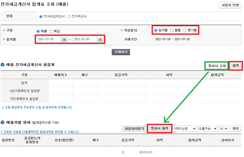 매출처의 명세가 필요하다면, "명세서 조회"(녹색 사각형) 클릭 후, "명세서 출력"